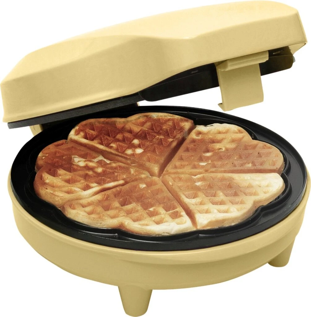 Bestron Wafelijzer voor klassieke hartwafels, Wafelmaker voor wafels in hartvorm, met indicatielampje & antiaanbaklaag, retro-design, 700 Watt, kleur: geel