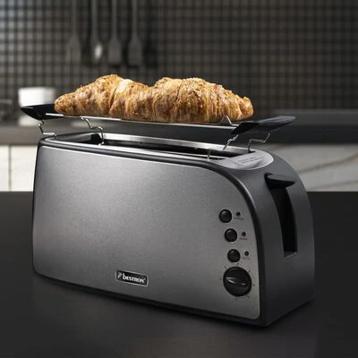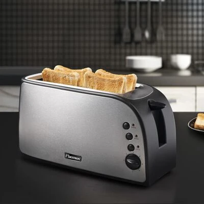 Dit trendy Bestron ATO900STE broodrooster van 1.500 W, met functies voor roosteren, opwarmen en ontdooien, is de ideale manier om 4 sneetjes heerlijke toast te bereiden.