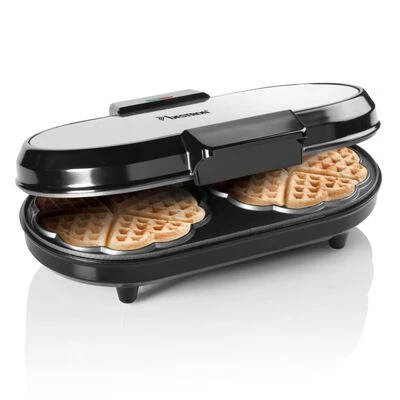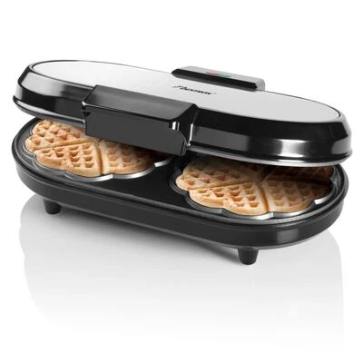 Met dit dubbele ADWM730S hartwafelijzer in zilver en zwart ontwerp van Bestron maak je in een mum van tijd heerlijke hartvormige wafels klaar.